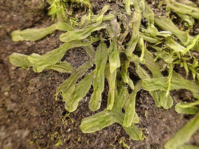 上はヤマトフタマタゴケの腹面を撮ったもので、白い毛が散生しています。 ヤマトフタマタゴケは雌雄同株のフタマタゴケ科の苔類で、この時期は腹面に生殖器官が見られます。 上の写真に見られる丸いものは、雄器を包み込む包膜だと思われます。 生殖器官は中肋から枝分かれした枝の背面に付き、この枝分かれした枝が包膜となるようです。