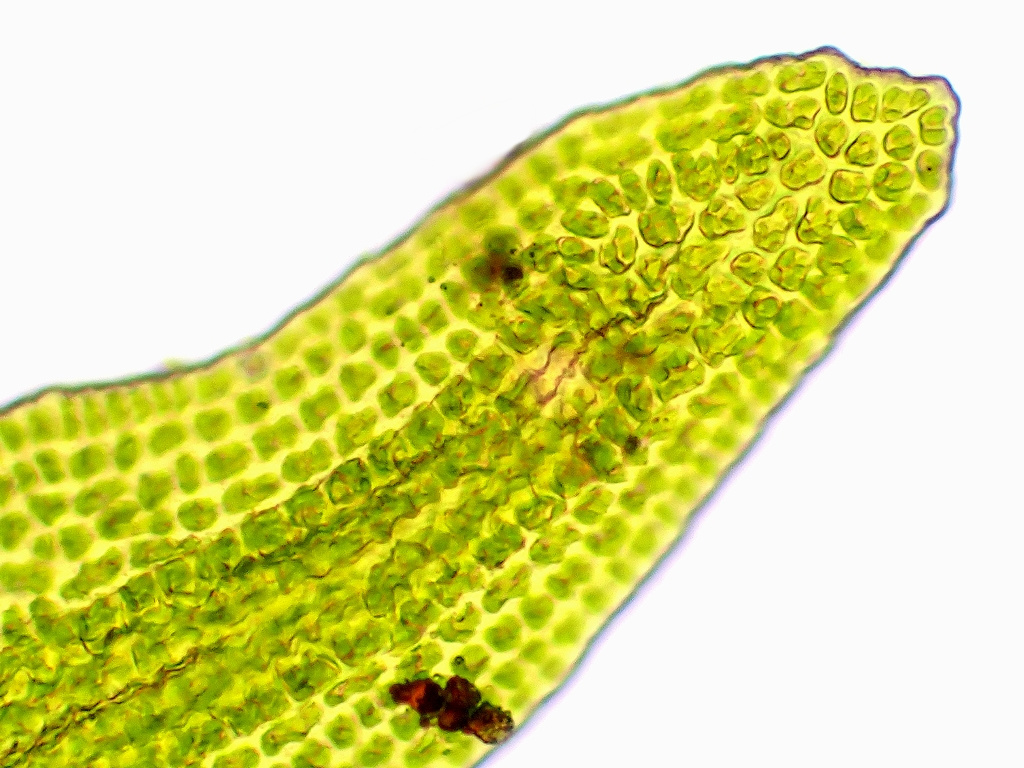 葉の基部付近の細胞は縦壁が波状に肥厚していますが、葉縁基部には縦壁が波状に肥厚しない細胞が1列に、上の写真では6~7個並んでいます。