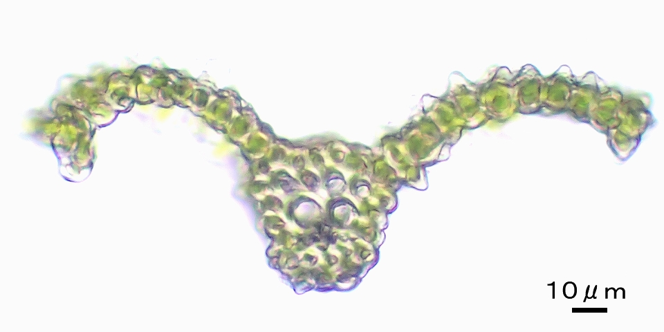 上は葉の横断面です。 葉身部は1細胞層で、背面にも腹面にも大きなパピラがあります。 葉縁は2細胞層で、この葉縁の細胞が歯になれば、対になった歯になります。
